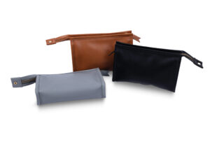 Beautiful faux leather PU cosmetic bag – hand stitched detail, black wipe-proof lining and quality contrast gold metal YKK zip. Ideal for any make up brand or as a high-end promotional or corporate gift. Self-fabric zip puller can be debossed with your company logo